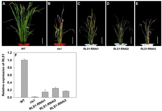 The RNAi construct introduced into WT cv. Nipponbare designed to knock down RLS1 comprised a 447 bp segment of the coding region. The effect of the transgene was to substantially reduce the abundance of RLS1 transcript in the leaves (Figure 3F). The phenotype of plants carrying the transgene was similar to that of the rls1 mutant (Figure 3A–E). Transgenic plants carrying an empty vector were phenotypically indistinguishable from WT [].