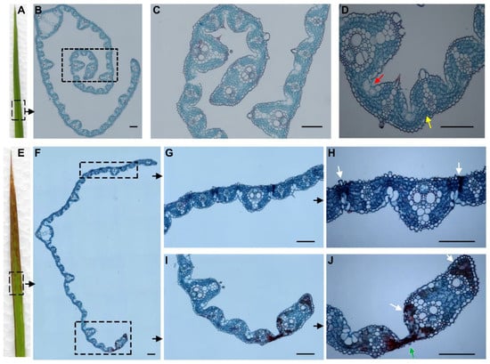 The microstructure of the leaf of WT and rls1 plants. (A–D) WT leaves feature normal mesophyll (yellow arrow) and bulliform (red arrow) cells; (E–J) The bulliform cells in the leaf margin of rls1 plants (green arrow) appear shriveled and atrophied. A portion of the mutant’s mesophyll cells appear atrophied and dead (white arrows). Bars: 100 µm.