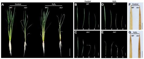 The performance of WT and rls1 plants in response to oxidative stress imposed by exposure to 60 mM H2O2 for two days. (A) rls1 and WT plants grown under either non-stressed or stressed conditions. Bar: 10 cm; (B–E) the appearance of the first, second, third and fourth fully expanded leaf (counting from the apex to the base of the main tiller) of (B,D) WT, (C,E) rls1 plants grown (B,C) in the absence and (D,E) in the presence of oxidative stress. Bars: 5 cm. (F,G) Histochemical detection (DAB staining) of H2O2 in the second fully expanded leaf of plants grown under (F) non-stressed, (G) stressed conditions. Bars: 2 cm.