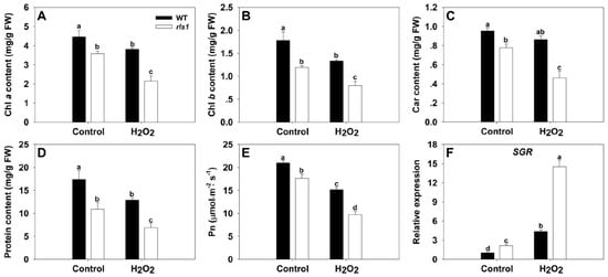 Chlorophyll loss and protein degradation are widely taken as markers of leaf senescence [,]. A comparison between the leaves of rls1 and WT plants grown under non-stressed conditions showed that the content of both the major photosynthetic pigments and total protein in the former was uniformly lower than that in the latter (Figure 6A–D). In plants exposed to H2O2 treatment, both the leaf chlorophyll and protein content was reduced not just in rls1 plants, but also in WT ones, but the extent of the decline was greater in the mutant. Measurement of the net photosynthetic rate (Pn) of leaves developed by non-stressed plants also revealed a significant difference between mutant and WT plants; in stressed plants, the difference in Pn between the mutant and the WT was magnified (Figure 6E). Quantification of the transcript abundance of SGR (senescence-induced STAY GREEN), the product of which regulates chlorophyll degradation [], showed that it was higher in rls1 leaves than in WT leaves developed under non-stressed conditions; the difference was even larger in stressed leaves (Figure 6F).