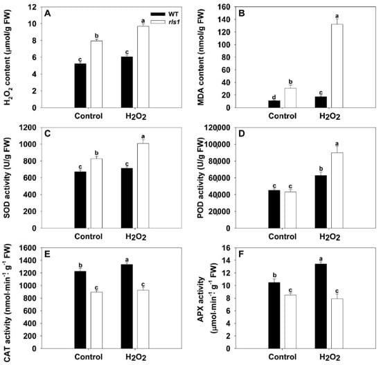 The biochemical response of WT and rls1 plants to exposure to oxidative stress. The content in the leaf of (A) H2O2; (B) MDA; (C–F) the activity of the anti-oxidant enzymes (C) SOD (superoxide dismutase); (D) POD (peroxidase); (E) CAT (catalase); (F) APX (ascorbate peroxidase). Values expressed in the form mean ± SE (n = 5). Significant differences between means (p < 0.05) indicated by different letters. FW: fresh weight.