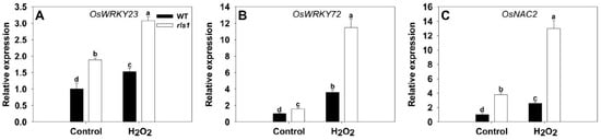 An investigation as to whether any transcription factors contributed to the premature senescence syndrome of rls1 showed that OsWRKY23, OsWRKY72 and OsNAC2 were all more strongly transcribed in rls1 than in WT plants grown under non-stressed conditions (Figure 9). Exposure to H2O2 up-regulated all three genes, more so in rls1 plants than in WT ones. The behavior of OsWRKY72 was especially notable: in the mutant, this gene was only weakly transcribed under non-stressed conditions, but in plants challenged by H2O2, the abundance of its transcript rose by about five-fold.