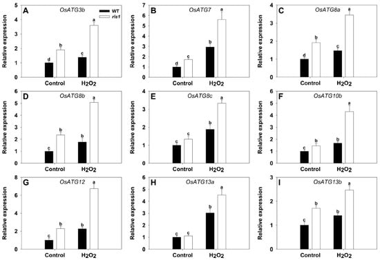 The transcriptional response of ATGs (autophagy-related genes) in WT and rls1 plants subjected to oxidative stress. (A) OsATG3b; (B) OsATG7; (C) OsATG8a; (D) OsATG8b; (E) OsATG8c; (F) OsATG10b; (G) OsATG12; (H) OsATG13a; (I) OsATG13b. For normalization purposes, the transcript abundance of each ATG in non-stressed WT was set to 1. Values expressed in the form mean ± SE (n = 3). Significant differences between means (p < 0.05) indicated by different letters.