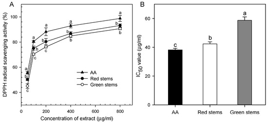 DPPH radical scavenging activity of extract from red and green D. officinale stems. (A) DPPH radical scavenging activity of AA, green and red stems extracts; (B) IC50 value of extract from red and green D. officinale stems. AA: ascorbic acid; DPPH: 2, 2-diphenyl-1-picryhydrazyl. Each data bar represents the mean ± standard deviation (SD; n = 3). Different letters above bars indicate significant differences among different treatments at p < 0.05 based on student’s t-test. Both red and green stems exhibit a significantly lower IC50 value according to a student’s t-test (p < 0.05) when compared with AA, and red stems demonstrate better antioxidant activities than green stems.