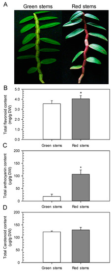 In general, plant pigments are composed of anthocyanins, carotenoid and flavonoids [12]. Total flavonoid content in green and red D. officinale stems was significantly different (Figure 2). Green stems exhibited significantly lower total flavonoid content (3.6 mg/g DW) than red stems (4.1 mg/g DW). The anthocyanin content in red stems (106.4 μg/g DW) was significantly (5.85-fold, p < 0.01) higher than in green stems (18.2 μg/g DW). However, the carotenoid content in green stems (122.1 μg/g DW) and red stems (129.9 μg/g DW) were not significantly different. These findings indicate that anthocyanins might be responsible for the red color in red D. officinale stems and higher anthocyanin content corresponds to a deeper red color, which also indicates that anthocyanins are found in small amounts in green stems. A detailed composition of anthocyanins in D. officinale stems still has to be clearly determined. The red color in peels of Pyrus pyrifolia fruit is highly correlated with the content and composition of anthocyanins [22].