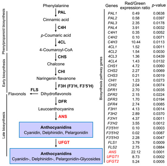 Transcript levels of genes involved in the anthocyanin biosynthesis in D. officinale stems. (A) simplified model of the anthocyanin biosynthetic pathway; (B) qRT-PCR analysis of the transcript abundance of the anthocyanin biosynthesis-related genes in peels of green and red stems. Red/green expression ratio is equal to the ratio between the transcript levels of red stems and the transcript levels of green stems. ANS, anthocyanidin synthase; 4CL, 4-coumarate CoA ligase; C4H, cinnamate 4-hydroxylase; CHI, chalcone isomerase; CHS, chalcone synthase; DFR, Dihydroflavonol 4-reductase; F3H, flavanone 3-hydroxylase; F3′H, flavonoid 3′-hydroxylase; F3′5′H, flavonoid 3′5′-hydroxylase; FLS, flavonol synthase; PAL, phenylalanine ammonia lyase. p value of expression ratio between red and green stems is calculated with a student’s t-test.