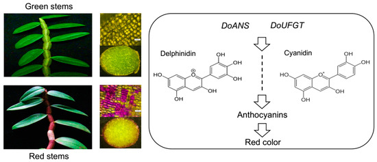 A summary of the differential anthocyanin accumulation in red and green D. officinale stems. D. officinale stems have green or red peels, and red stems are caused by the accumulation of anthocyanins. The red color is dominated by anthocyanin derivatives, delphinidin and cyanidin, which mainly exist in anthocyanin-containing epidermal cells. In addition, DoANS and DoUFGT are vital regulatory genes in anthocyanidin accumulation; DoANS, the gene coding anthocyanidin synthase from D. officinale; DoUFGT, the gene encoding UDP-glucose flavonoid 3-O-glucosyltransferase from Dendrobium officinale.