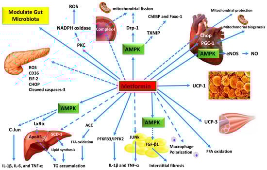 Metformin, an old drug with magical roles, has drawn much attention in recent years due to its newly recognized beneficial effects. Metformin has diverse effects through its action on different tissues including, but not limited to, liver, adipose, skeletal muscle, intestine, brown fat, heart, vascular, pancreas, and bones (as shown in Figure 1). These diverse effects may due to the action of metformin on several enzymes located in the mitochondria and ER, as AMPK is one of the primary therapeutic targets in liver, cardiovascular, and adipose tissue.
