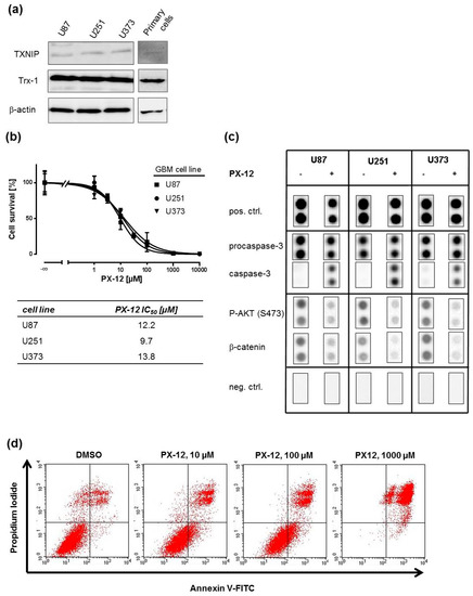 GBM cell lines and high-grade glioma tissue have been reported to express significant amounts of Trx [16,28,29]. In order to confirm this, we determined Trx and TXNIP expression in three established GBM cell lines—U87, U251, and U373—and primary GBM cells, which have previously been shown by us to be intrinsically resistant to TMZ and cisplatin [30]. Trx-1 and TXNIP protein was expressed in all cells as determined by Western blotting (Figure 1a). To investigate whether GBM cell lines are responsive to Trx-inhibition, 1-methyl-2-imidazolyl-disulfide (PX-12), a pharmacological inhibitor of Trx, was applied. First, we investigated the effect of PX-12 at increasing concentrations on cell survival in 3-(4,5-dimethylthiazol-2-yl)-2,5-diphenyltetrazolium bromide (MTT) assays (Figure 1b, upper graph). An IC50 concentration of around 10 µM was determined for all three cell lines (Figure 1b, lower table). This concentration was used to assess the effect of PX-12 on apoptosis-related proteins such as (pro-)caspase-3, AKT-kinase (protein kinase B), and β-catenin (Figure 1c). PX-12 strongly induced expression of active caspase-3 and reduced phosphorylation of AKT-kinase and expression of β-catenin in a similar fashion in all three cell lines. These findings are in line with a concentration-dependent increase of apoptotic rates of U251 cells after PX-12 exposure as determined by annexin-V/propidium iodide staining (Figure 1d). Similar results were obtained with U87 and U373 cells (Figure S1).