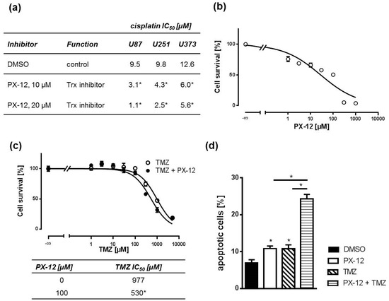 Next, we investigated whether Trx inhibition by PX-12 sensitizes GBM cell lines to the cytostatic drug cisplatin in MTT assays. Yet, TMZ is the only substance for which a statistically significant and clinically relevant benefit in both overall survival and progression-free survival has been demonstrated [4]. However, it is very difficult to handle in the laboratory setting as it must be given to GBM cells in concentrations as high as or even beyond its solubility [30]. Thus, we also used cisplatin as a model substance with a similar molecular mechanism of action: both substances interfere with DNA, resulting in strand breaks and apoptosis. Therefore, we treated cells with an IC50 concentration of PX-12 and increasing concentrations of cisplatin. Treatment with 10 µM PX-12 sensitized all GBM cell lines significantly to cisplatin when administered 1 h prior to cisplatin exposure. The sensitizing effect was concentration dependent, since 20 µM PX-12 triggered a more pronounced effect (Figure 2a). Next, we asked if our findings can be translated to a more clinically relevant scenario of primary GBM cells derived from a tumor biopsy. Initially, we determined the IC50 concentration of PX-12 in these cells (Figure 2b). Thereafter, we treated primary cells with this IC50 concentration and increasing TMZ concentrations. As observed with cisplatin in GBM cell lines, PX-12 was also capable of sensitizing primary GBM cells to TMZ as assessed by MTT assays (Figure 2c). This was paralleled by an increase in apoptotic rates after concomitant treatment of IC50 concentrations of PX-12 and TMZ as compared to single treatment alone (Figure 2d and Figure S2).