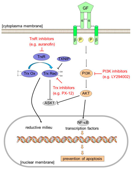 Schematic overview of the Trx system and tentative pathways involved in drug resistance of GBM cells. Potential drug insult to overcome resistance is presented in red. Abbreviations: AKT, protein kinase B (PKB); ASK1, apoptosis signal-regulating kinase 1; GF, growth factor; NF-κB, nuclear factor kappa-light-chain-enhancer of activated B cells; PI3K, phosphatidylinositide 3-kinase; Trx, thioredoxin; TrxR, Trx-reductase TXNIP, Trx-interacting protein.