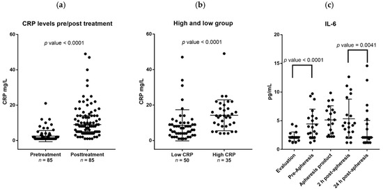 Figure 1. Effects of granulocyte colony-stimulating factor (G-CSF) on C-reactive protein (CRP) and systemic interleukin-6 (IL-6) levels. All results are presented as the levels for individual patients, the median levels and the 75% percentiles. (a) This figures shows CRP level prior to (pretreatment) and after four days of G-CSF administration (post-treatment) for all donors with detectable CRP level at these two time points. A significant increase in CRP levels was observed after G-CSF treatment; (b) The figure shows a comparison between the differences in CRP levels (i.e., levels during G-CSF minus the pretherapy level; mg/L) for those patients who had low (≤2 mg/L) and high pretherapy CRP level (>2 mg/L); (c) This figure presents the variations in serum IL-6 levels (pg/mL) for 20 healthy stem cell donors during mobilization and harvesting of peripheral blood stem cells; each dot represents the observations for one patient at the given time point. Treatment with G-CSF induced a significant increase in systemic IL-6 levels (evaluation versus pre-apheresis levels, p-value < 0.0001). This increase was maintained 2 h after apheresis, i.e., the pre-apheresis levels did not differ significantly from 2 h postapheresis levels (p-value 0.275). However, the IL-6 levels decreased significantly from 2 h to 24 h postapheresis (2 h postapheresis levels versus 24 h postapheresis levels, p-value <0.0041), and this decrease represents a normalization of the systemic IL6 levels during the first 24 h after apheresis (i.e., 24 h postapheresis levels versus pretherapy/evaluation levels, p-value 0.123). The median time from donor evaluation (the first sample, also referred to as the pretreatment sample) to start of G-CSF therapy was 16 days. The levels in the graft supernatants (apheresis product, 19 patients tested) are also presented.