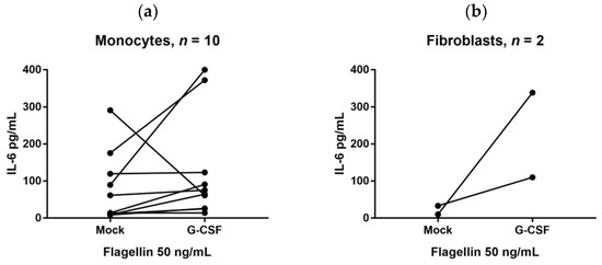 Figure 3. IL-6 release by monocytes derived from 10 healthy individuals (a). The cells were cultured with and without exogenous G-CSF 50 ng/mL in the presence of the TLR agonists Flagellin (TLR5) 50 ng/mL. The results are presented as the IL-6 levels in culture supernatants; (b) IL-6 release by HFL1 and Hs27 fibroblasts cultured with and without exogenous G-CSF 50 ng/mL in the presence of Flagellin (TLR5) 50 ng/mL; the results from a typical experiment are presented. The results are presented as the IL-6 levels in culture supernatants; the effect of G-CSF on IL-6 release by fibroblasts was detected in six independent experiments.