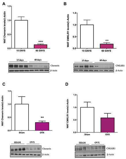 Total-protein samples were extracted from gWAT, and western blots were performed as previously described [47,48]. Briefly, total-protein samples prepared from lysates from each tissue (20 µg) were subjected to sodium dodecyl sulfate–polyacrylamide gel electrophoresis (SDS-PAGE), electro-transferred onto an Immun-Blot® polyvinylidene difluoride membrane (Bio-Rad, Hercules, CA, USA), and probed with antibodies against chemerin and CMKLR1. Dilutions of primary antibodies were 1:1000, and we employed mouse anti-chemerin (ALX-804-868-c150, Enzo Life Sciences, Farmingdale, NY, USA), rabbit anti-CMKLR1 (ab64881, Abcam, Cambridge, UK), and mouse anti-β-actin (A5316, Sigma Aldrich, St. Louis, MO, USA) antibodies. Secondary antibodies were purchased from Dako and used at dilution 1:5000 in 3% BSA in TBS-T (Tris-buffered saline with 0.1% Tween 20). For protein detection, we used horseradish peroxidase-conjugated secondary antibodies (Dako, Glostrup, Denmark) and chemiluminescence (Pierce ECL Western Blotting Substrate, Thermo Scientific, Waltham, MA, USA). Membranes were then exposed to X-ray films (Super RX, Fuji Medical X-Ray Film, Fujifilm, Minato, Japan) and developed with developer and fixing liquids (AGFA, Mortsel, Belgium) under appropriate dark-room conditions.