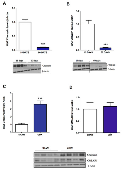 Effects of age and sex steroids on chemerin and CMKLR1 protein expression in gWAT of male rats. (A,B) Quantification of immunoblot data and a representative immunoblot (lower panel) of chemerin and CMKLR1 during postnatal development in male rats (15 days and 60 days of age). (C,D) Quantification of immunoblot data and a representative immunoblot (lower panel) of chemerin and CMKLR1 relative to control (Sham) two weeks after gonadectomy (GDX). Expression of the indicated proteins was normalised to β-actin as the control. Data are expressed as mean ± SEM (n = 7 to 8 animals per group); *** p < 0.001: 15 days vs. 60 days and GDX vs. controls.