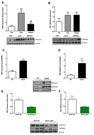 Nutritional status and leptin exert effects on chemerin and CMKLR1 expression in gWAT. (A,B) Quantification of immunoblot data and a representative immunoblot (lower panel) of chemerin and CMKLR1 in gWAT of ad libitum fed mice and mice after 24 h fasting and 24 h refeeding. (C,D) Quantification of immunoblot data and a representative immunoblot (middle panel) of chemerin and CMKLR1 in gWAT in wild-type and ob/ob mice. (E,F) Quantification of immunoblot data and a representative immunoblot (lower panel) of chemerin and CMKLR1 in gWAT of ob/ob mice treated with vehicle (veh) or leptin. Expression of the indicated proteins was normalised to β-actin or heat shock protein 90 (HSP90) as the control. Data are expressed as mean ± SEM (n = 7 to 8 animals per group); * p < 0.05, ** p < 0.01: fasting vs. controls; $$ p < 0.01: refed vs. controls.
