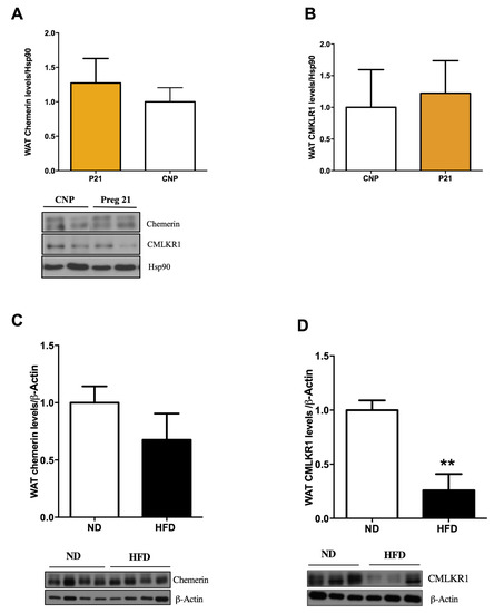 Effects of gestation and a high-fat diet (HFD) on chemerin and CMKLR1 protein expression in gWAT. (A,B) Quantification of immunoblot data and a representative immunoblot (lower panel) of chemerin and CMKLR1 in control (non-pregnant) rats and at 21 days of gestation. (C,D) Quantification of immunoblot analysis and a representative immunoblot (lower panel) of chemerin and CMKLR1 in rats on the HFD and in the control (Standard diet). Expression of the indicated proteins was normalised to β-actin or HSP90 as the control. Data are expressed as mean ± SEM (n = 7 to 8 animals per group); ** p < 0.01: HFD vs. controls.