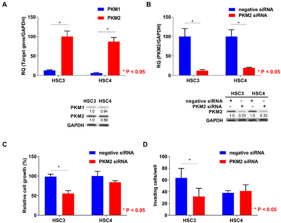 Stealth Select RNAi (siRNA) for PKM1 and PKM2 was purchased from Invitrogen (Carlsbad, CA, USA) and AllStars Negative Control siRNA from Qiagen (Valencia, CA, USA). HSC3 and HSC4 cells were cultured in six-well plates until 40% confluence. Transfection of 10-nM siRNA was performed with Lipofectamine 3000 (Invitrogen) according to the manufacturer’s recommendations. Briefly, the mixture of Opti-MEM Reduced Serum Medium (Invitrogen) including siRNA and Lipofectamine 3000 was added into the wells. After 24 h from transfection, the cells were used for further analyses.