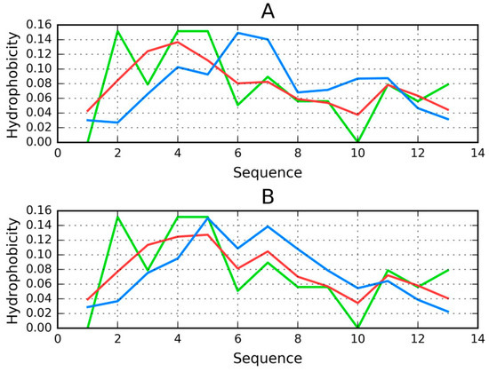 15], the distribution of hydrophobicity in a peptide may—regardless of its accordance with the theoretical distribution—give rise to amyloid formation, as long as the environment favors linear complexation of additional peptides, with alternating bands of high and low hydrophobicity emerging along the axis of the fibril. This is visualized in