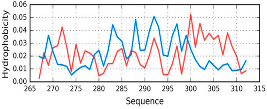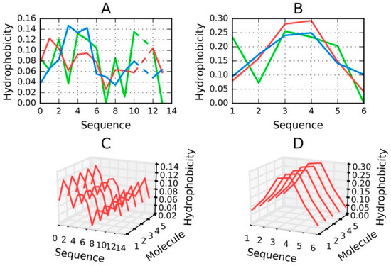 Figure 8 evidences the appearance of structures that are characterized by linear propagation of hydrophobicity peaks/troughs, which is a precondition of amyloid formation. As highlighted by to-date observations and interpretations, the environment must “support” the creation of such forms. It is thought that under natural conditions the structure of water does not favor the formation of amyloid fibrils.