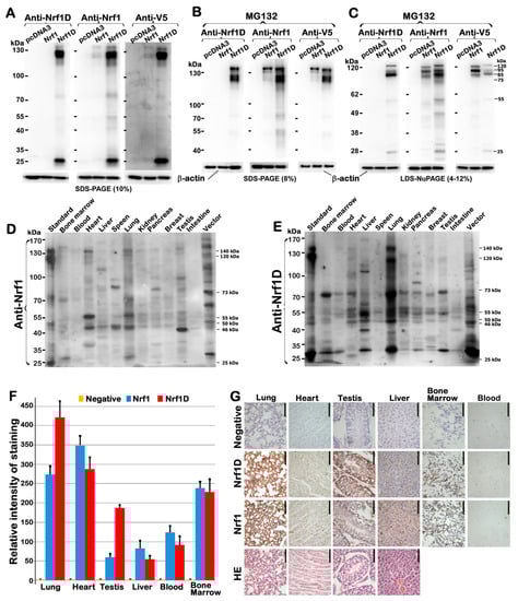 Differential expression of Nrf1D and Nrf1 proteins in mouse tissues examined. (A–C) Three independent experiments of COS-1 cells, that had been transfected with an expression construct for Nrf1, Nrf1D or empty pcDNA3.1 vector and then treated with the proteasomal inhibitor MG132 (5 μmol/L), showed that both Nrf1D and Nrf1 were identified by cross-immunoreactivity with three distinct antibodies against aa 192–741 in Nrf1, Nrf1D’s C-terminus-specific peptide, and their C-terminally-tagged V5 ectope, respectively. (D,E) Differential expression levels of Nrf1- and Nrf1D-derived proteins in different tissues from mice were examined by Western blotting with either Nrf1-recognized or Nrf1D-specific antibodies. (F,G) Anti-Nrf1D and -Nrf1 antibodies were also applied for immunohistochemical examinations of six different tissues, including lung, heart, testis, liver, bone marrow and blood (bar = 100 μm). Subsequently, the intensity of immunohisto- chemical staining in examined tissues was calculated and, is shown graphically (F). In addition, the first row “negative” images (G) were obtained from immunohistochemistry with the pre-immunized serum, instead of the primary antibody against Nrf1D-specific peptide, both of which was produced in the same animals.