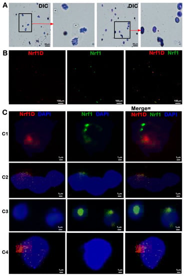 Fluorescence in situ hybridization (FISH) of both transcripts of Nrf1D and Nrf1 in bone marrow-derived cells. (A) Differential interference contrast (DIC) images (bar = 50 μm) of mouse bone marrow-derived cells were achieved in two different fields of vision by microscopy. (B,C) FISH of Nrf1D (red) and Nrf1 (green) transcripts expressed in bone marrow cells was conducted with their specific probes of Nrf1 (5′-CGCACGATGGCTGACC AGCAGGCTC-3′, which retained in Nrf1 but not Nrf1D, with its 5′-end labeled by 5-FAM, emitting a green fluorescence) and Nrf1D (5′-CGATTG CTTCGAGAAAAGGAAAATGAGAAGTGC-3′, which was labeled by Texas Red at its 5′-end so as to emit a red fluorescence). Nuclear DNA was stained by DAPI (blue). These images of indicated cells with different magnification (B, bar = 100 μm; C, bar = 1 μm) were acquired in different visual fields.