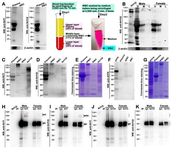 Detection of Nrf1D existing in mouse blood plasma. (A) Shows immunoblots of mouse blood plasma and RBC with anti-Nrf1 and Nrf1D-specific antibodies (left upper two panels). The procedure of blood fractionation by centrifuging at different speeds was illustrated (right two panels). (B) Distinct blood fractions from male and female mice were determined by Western blotting with Nrf1D-specific peptide antibody. The Nrf1D-expressed cell lysates served as a positive control. In addition, secreted β-actin was detected in blood plasma (bottom). Abbreviations: U, upper layer of plasma; M, middle layer containing WBCs; L, lower layer containing RBCs. (C–G) Further extracts from blood plasma, RBCs and WBCs were visualized by immunoblotting with Nrf1 antibody (C) or Nrf1D-specific peptide antibodies (D). But, similar blood fractions were not cross-immunoreactive with ATF6-specific antibodies (F). Total protein extracts from the blood fractions were also seen by Coomassie Blue staining (E,G). (H–K) Immunoprecipitation (IP) of the blood plasma from male and female mice (i.e., these samples were firstly clarified by pre-incubating with pre-immunized serum and Protein-G Sepharose beads) was employed with anti-Nrf1, anti-Nrf1D antibodies, or IgG (served as an internal negative control). Subsequent immunocomplexes were visualized by Western blotting with indicated antibodies. The star (*) indicates Nrf1D isoforms from immunoprecipitation (H,I).