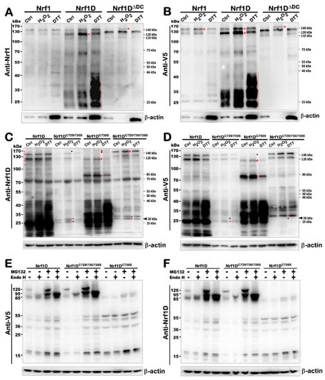 In vitro endoglycosidase (Endo)-H reactions (Figure 5C) revealed that, like wild-type Nrf1 as described [9,18], Nrf1D was also N-glycosylated to become a ~120-kDa glycoprotein, which is then deglycosylated to yield another ~95-kDa deglycoprotein, prior to being proteolytically processed to generate an ~85-kDa N-terminally-truncated isoform. Together, the selective proteolytic processing of Nrf1D, as well as its C-terminally-truncated mutant Nrf1DΔDC, is postulated to have occurred by a potential mechanism similar to that accounting for Nrf1, even in the presence of proteasomal inhibitor MG132 (Figure 5C and Figure S3).