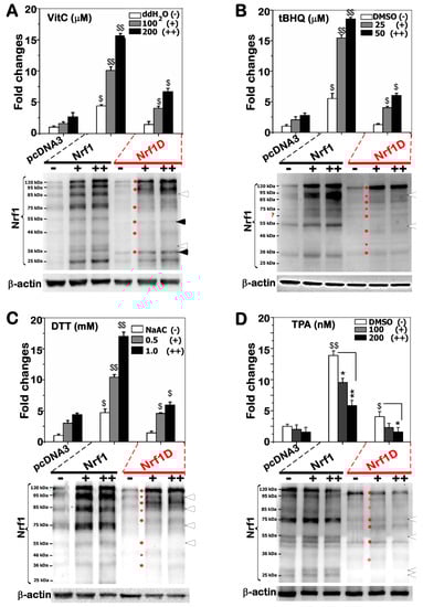 Further experiments revealed that Nrf1-mediated reporter gene was also substantially activated by stimulation of cells with either tBHQ or DTT, whilst Nrf1D only displayed a lower activity to transactivate the ARE-driven gene (Figure 7B,C). Intriguingly, treatment of cells with tBHQ or DTT caused a slightly faster electrophoretic migration of the full-length Nrf1D (of 749 aa) to ~110-kDa, only one longer polypeptide resolved by 4–12% LDS-NuPAGE gels, whereas intact Nrf1 (of 741-aa) was post-translationally processed to exhibit three or four major longer isoforms of between ~120-kDa and ~75-kDa (Figure 7B,C, lower panels). These findings indicate that the membrane- topological folding of Nrf1D and its proteolytic processing are certainly distinctive from those of Nrf1, particularly occurring under oxidative and/or reducing conditions. However, treatment of Nrf1-expressing cells with 12-O-tetradecanoylphorbol-13- acetate (TPA, a tumor promotor to induce AP-1 that comprises c-Jun and c-Fos) resulted in a significant decrease in the ARE-driven reporter activity (Figure 7D). Similar decreases in the basal and Nrf1D-mediated activity of the reporter gene were also determined. In addition, no marked changes in the abundances of Nrf1- or Nrf1D-derived isoforms were examined following TPA treatment, albeit they appeared to be unstable ((Figure 7D, lower panels). Taken together, Nrf1 (and/or Nrf1D) -mediated ARE-battery gene expression is likely repressed by TPA-stimulated transcription factors (i.e., AP-1).