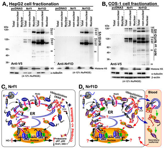 About COS-1 or HepG2 cells (3 × 105) were seeded in 6-well plates and allowed for growth for 24 h in DMEM containing 10% FBS. After reaching the 70% confluence, the cells were transfected with an expression construct for Nrf1 and Nrf1D, or empty pcDNA3.1 vector. Following 24-h recovery from transfection, the cells were harvested and then subjected to incubation with ice cold Nuclei EZ lysis buffer (0.5 mL added to each dish). The nuclei-containing pellets were collected by centrifuging at 500× g for 5 min at 4 °C. The supernatant were considered as the non-nuclear fractions, while the sediment nuclear fractions were saved. Subsequently, the sediment was re-suspended by adding 0.5 mL of the nuclei EZ lysis buffer (From Sigma-Aldrich, Saint Louis, MO, USA) and vortexing at moderate to high speeds. After being washed with the lysis buffer for 3 times, the clarified nuclei pellets were collected by centrifuging as described above. The resulting nuclear and non-nuclear fractions were diluted with RIPA lysis buffer (Beyotime, Shanghai, China), and determined by western blotting with distinct antibodies against Nrf1, Nrf1D-specific peptides or their C-terminal V5 tag.