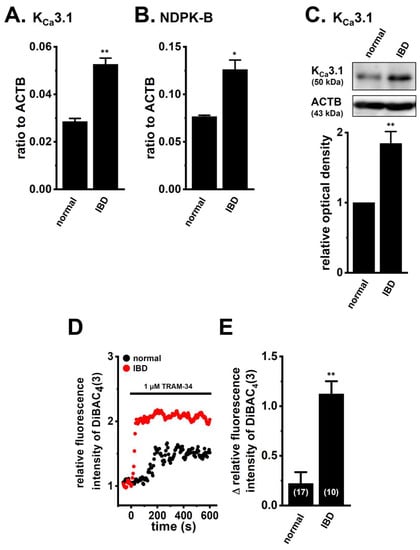 - Ohya, S.; Fukuyo, Y.; Kito, H.; Shibaoka, R.; Matsui, M.; Niguma, H.; Maeda, Y.; Yamamura, H.; Fujii, M.; Kimura, K.; et al. Up-regulation of KCa3.1 K+ channel in mesenteric lymph node CD4+ T-lymphocytes from a mouse model of dextran sodium sulfate-induced inflammatory bowel disease. Am. J. Physiol. Gastrointest. Liver Physiol. 2014, 306, G873–G885. [Google Scholar] [CrossRef] [PubMed]