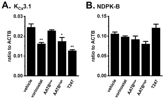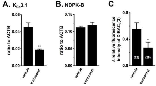 2.2. Decreased Expression and Activity of KCa3.1 by Treatment with the Pan-HDACi, Vorinostat, and HDAC2- and HDAC3-Selective HDACis in CD4+ T Cells of IBD Model Mice