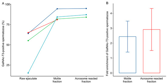 Capacitation and acrosome reaction cause major changes to the membrane composition and protein content, and we therefore further tested whether the equatorial GalNAc-T3 expression was affected by acrosomal exocytosis. Swim-up purified spermatozoa were capacitated and acrosomal exocytosis induced with the calcium ionophore, ionomycin (n = 3). Inducing acrosomal exocytosis did not significantly change the fraction of spermatozoa with high equatorial expression of GalNAc-T3 (mean 85.4% vs. 88.7%, Figure 2A,C), and the fold enrichment relative to the raw ejaculate was similar to what was observed for the motile fraction (mean 2.4 vs. 2.9, Figure 2B,C).