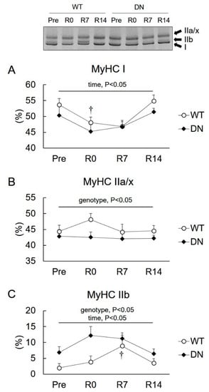 - Miyazaki, M.; Hitomi, Y.; Kizaki, T.; Ohno, H.; Katsumura, T.; Haga, S.; Takemasa, T. Calcineurin-mediated slow-type fiber expression and growth in reloading condition. Med. Sci. Sports Exerc. 2006, 38, 1065–1072. [Google Scholar] [CrossRef] [PubMed]