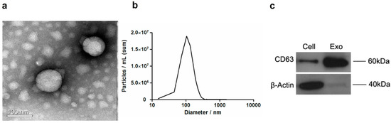 Cells were lysed with RIPA buffer (Sigma, St. Louis, MO, USA). Isolated exosomes were lysed in 5× protein loading buffer (Beyotime, Shanghai, China). Equivalent amounts of cell lysate and exosomes were subjected to 10% SDS-polyacrylamide gel and transferred to PVDF membrane (Millipore, Burlington, MA, USA). After being blocked with 5% skim milk for 1 h at room temperature, the membrane was probed with the following primary antibodies: CD63 (Abcam, Cambridge, MA, USA, 1:2000), β-Actin (Abcam, 1:2500), and the HRP-conjugated secondary antibody against rabbit (Abcam, Cambridge, MA, USA, 1:5000). The blot was visualized by enhanced chemiluminescence using ChemiDoc XRS system (Bio-Rad Laboratories, Hercules, CA, USA).