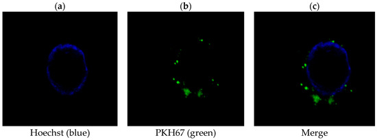 PLC/PRF/5 cells-derived exosomes were labeled with PKH67 Green Fluorescent Cell Linker Mini Kit (Sigma-Aldrich, St. Louis, MO, USA), according to the manufacturer’s protocol with minor modifications. Exosomes diluted in PBS were added to 100 μL Diluent C. In parallel, 0.5 μL PKH67 dye was added to 100 μL Diluent C and incubated with exosomes solution for 4 min. To bind excess dye, 200 μL 1% BSA/PBS was added. The labeled exosomes were filtered using 0.22 μm filter to remove excess dye and added onto THP-1 cells cultured in a Thermo Scientific eight-chamber slide. After incubation for 24 h, cells were stained with Hoechst 33258 (Sigma-Aldrich, St. Louis, MO, USA) and examined by confocal fluorescence microscopy.