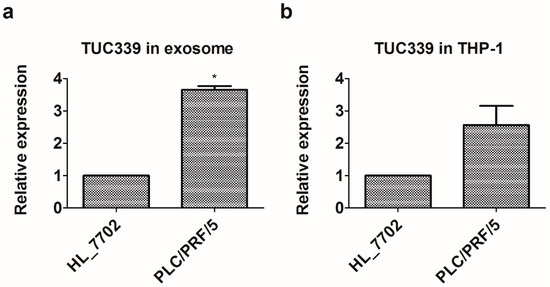 Since PLC/PRF/5-derived exosomes can be internalized by THP-1 cells and PLC/PRF/5-derived exosomes carry enriched amount of TUC339, we, therefore, reasoned that PLC/PRF/5 cells can deliver TUC339 to neighbor THP-1 cells more than HL-7702 cells do. In order to confirm this, we cultured PLC/PRF/5 and HL-7702 cells to the same confluency, then collected the same amount of culture medium from both cell cultures and transferred supernatants onto THP-1 cells, respectively. After 24 h of incubation, total RNAs were isolated from THP-1 cells. Endogenous TUC339 was quantified by qRT-PCR. As seen in Figure 3b, we found THP-1 cells treated with PLC/PRF/5 supernatant expressed an elevated level of TUC339 than treated with an HL-7702 supernatant. This result suggests HCCs can deliver TUC339 to neighbor THP-1 cells more than normal liver cells do. We, thus, wonder the biological function of these HCC-secreted lncRNAs in the following studies by focusing on TUC339.