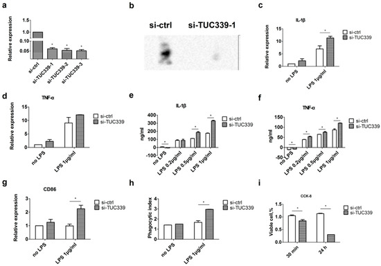 Knockdown of TUC339 in THP-1 cells leads to increased pro-inflammatory cytokine production, increased co-stimulatory molecule expression, enhanced phagocytosis, and reduced viability. THP-1 cells were transfected with siRNAs against TUC339 or unrelated siRNA control. Both (a) qRT-PCR and (b) Northern blot analysis showed effective knockdown of TUC339 by siRNAs. Upon TUC339 knockdown, IL-1β (c) and TNF-α (d) mRNAs were elevated in THP-1 cells, which is shown by qRT-PCR. IL-1β (e) and TNF-α (f) secretion were elevated, which is shown by ELISA. (g) CD86 mRNA was elevated as shown by qRT-PCR. (h) Phagocytosis was enhanced in LPS challenged THP-1 cells upon TUC339 knockdown. (i) Cell viability was reduced in THP-1 cells upon TUC339 knockdown, which is shown by the CCK-8 assay. Data represent mean ± SEM of three independent experiments. * p < 0.05.
