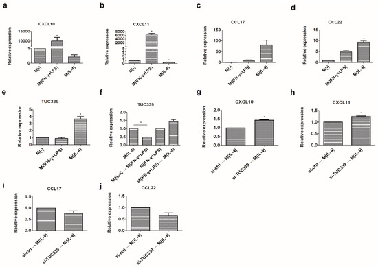 Macrophages can be polarized to M1 or M2 subgroup upon activation by environmental stimulator. We wondered whether TUC339 is involved in balancing M1/M2 polarization. In order to test this, we first generated M(IFN-γ + LPS) and M(IL-4) macrophages in vitro by incubating THP-1 cells with corresponding stimulators. M1/M2 phenotypic and functional discriminating markers such as CXCL10, CXCL11, CCL17, and CCL22 were examined using qRT-PCR. As expected, M1-associated markers CXCL10 and CXCL11 were significantly up-regulated in M(IFN-γ + LPS) (Figure 6a,b) while M2-associated markers CCL17 and CCL22 were significantly up-regulated in M(IL-4) (Figure 6c,d). These results confirmed that distinct macrophage subgroups were developed by the polarization conditions used in this study.