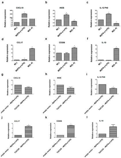 TUC339 promotes U937 macrophages transition to M(IL-4) phenotype. U937 macrophage cells were cultured in the presence of IFN-γ (20 ng/mL) plus LPS (100 ng/mL) or in IL-4 (20 ng/mL). Polarization-specific biomarkers were analyzed by qRT-PCR assays using RNA collected from macrophages 18 h post-treatment. As expected, CXCL10 (a) iNOS (b) and IL-12 p40 (c) were elevated in M(IFN-γ + LPS) while CCL17 (d) CD206 (e) and IL-10 (f) were elevated in M(IL-4). (g–l) Macrophages were transfected with the TUC339 expression vector or the empty control vector and then stimulated with IFN-γ + LPS for M1 polarization. Over-expression of TUC339 decreased expression of M1 maker CXCL10 (g) iNOS (h) and IL-12 p40 (i) and increased expression of M2 maker CCL17 (j) CD206 (k) and IL-10 (l). Data are representative of three separate experiments and show the means ± SEM. * p < 0.05.