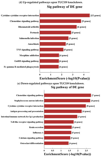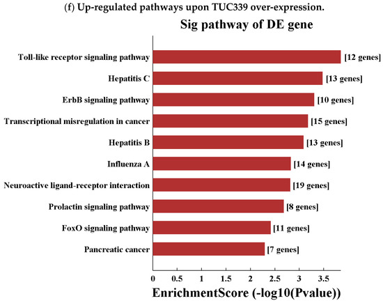 Transcriptome-wide analysis of TUC339 knockdown and over-expression. Differential expressions of genes are plotted (axis, intensity). (a) 273 up-regulated genes and 315 down-regulated genes with greater than a two-fold change upon TUC339 knockdown. (b) 942 up-regulated genes and 786 down-regulated genes with greater than a two-fold change upon TUC339 over-expression. (c) Down-regulated pathways upon TUC339 over-expression. (d) Up-regulated pathways upon TUC339 knockdown. (e) Down-regulated pathway upon TUC339 knockdown. (f) Up-regulated pathways upon TUC339 over-expression. The bar plot shows the top 10 Enrichment Score (−log10 (p value)) values of the significant enrichment pathways.