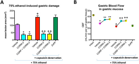 Besides NO and H2S, carbon monoxide (CO) has also recently been reported to play an essential role in the maintenance of gastric mucosal integrity due to its anti-inflammatory and vasoactive properties involved in the regulation of GBF [9,10,11]. Recently our group reported that gaseous mediators NO, H2S, and CO, exhibited gastroprotective activity but in contrast to NO and H2S, the CO-induced protection was found to be independent on the activity of afferent sensory neurons [8,11]. However, the contribution of TRPV1 and CGRP to CO-mediated gastroprotection against ethanol-induced gastric lesions has not been fully investigated and needs further evaluation.