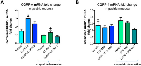 Figure 5A shows that CGRP-α mRNA fold change in gastric mucosa of vehicle-pretreated rats administered with 75% ethanol was not significantly affected as compared with respective values in intact gastric mucosa. Pretreatment with CORM-2 significantly increased the mRNA fold change for CGRP-α as compared with respective vehicle-control group in rats without capsaicin denervation (p < 0.05) but not in those with capsaicin-induced sensory denervation (Figure 5A). In gastric mucosa of rats with capsaicin denervation, CGRP-α mRNA fold change was not significantly affected as compared with vehicle-control group with intact sensory nerves (Figure 5A). Figure 5B shows that CGRP-β mRNA fold change in gastric mucosa pretreated with vehicle and administered with 75% ethanol was significantly decreased as compared with respective values in intact gastric mucosa and this fall in fold change of CGRP-β mRNA remained without significant change in capsaicin denervated animals with or without CORM-2 combined or not with CGRP.