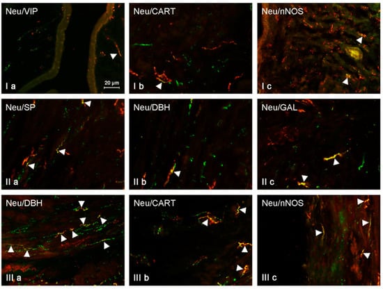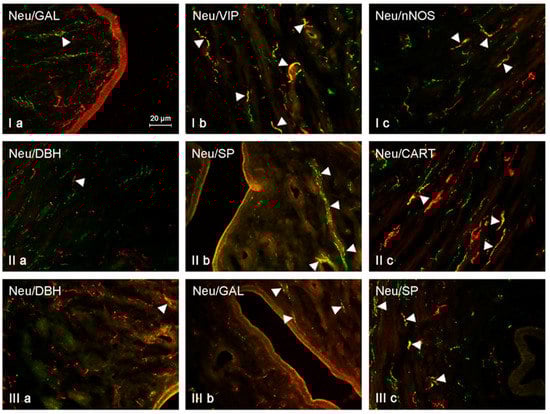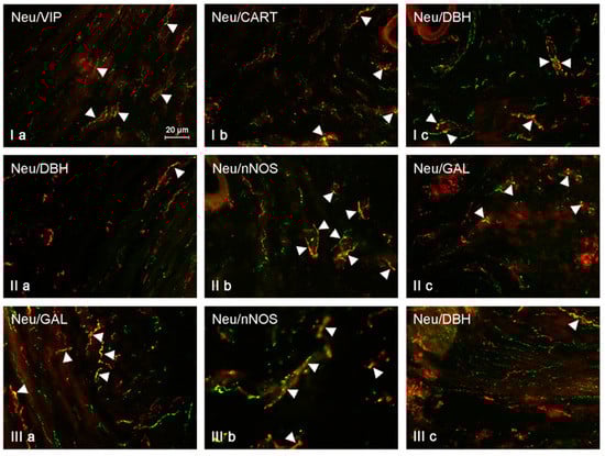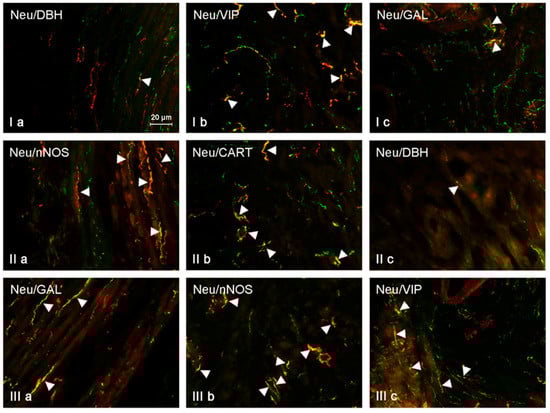 NRG-positive nerves (NRG-1+ green) immunoeractive to DBH, SP, VIP, nNOS, GAL, and CART (red) in the muscular layer of the uterine horns of control animals (a) and pigs treated with low (b) and high (c) dose of bisphenol A. Nerves simultaneously immunoreactive to NRG-1 and other substances (yellow) are indicated with arrowheads.