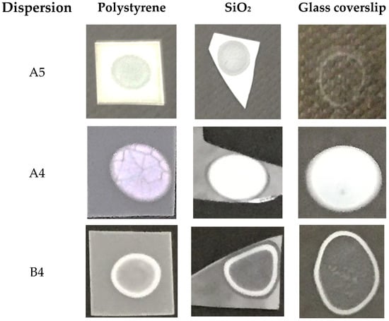 Figure 2). The reason for this can be related to the higher relative ratio of PDDA to PMMA in A5 and A4-derived coatings than in the B4-derived ones. The interpretation for the ring appearing after casting B4 dispersion was related to the coffee-ring effect; such ring deposition occurs when liquid evaporation from the edge is replenished by liquid from the interior so that the resulting outward flow can carry most of the dispersed material to the edge [
