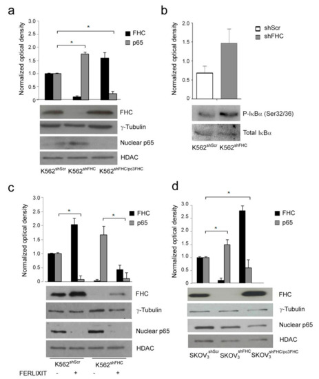 To evaluate whether the inverse correlation of FHC and NF-κB activity was restricted to K562 erythroleukemia cells, we also analyzed nuclear p65 in a pool of stably FHC-silenced SKOV3 human ovarian adenocarcinoma cells (SKOV3shFHC). Similarly to the results observed on K562shFHC cells, the steady-state amount of nuclear p65 in SKOV3shFHC was about twice, as compared to control SKOV3shRNA cells, and was strongly down-regulated upon FHC reconstitution (SKOV3shFHC/pc3FHC). (Figure 1d), indicating that this phenomenon may be shared by different cancer cell lines.