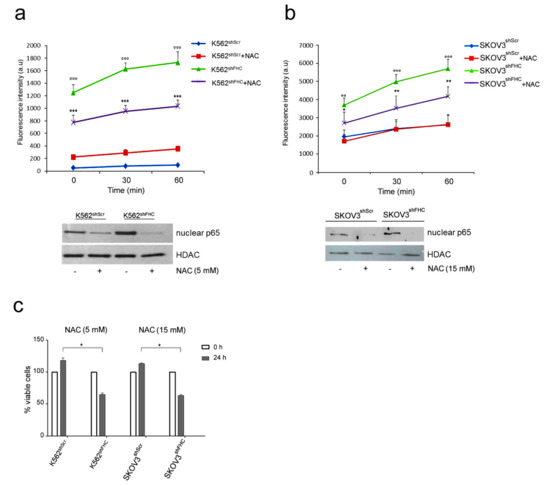 An impaired expression of FHC is responsible of the increase of the labile iron free pool and generation of reactive oxygen species (ROS) [9]. In previous works, we demonstrated that FHC knock-down is accompanied, among other phenomena, by increased ROS production in different cell lines [25]. Since ROS have been reported to affect the activity of NF-κB [28], we asked whether the increased NF-κB activity in FHC-silenced cells was due to an indirect effect mediated by ROS. To this end, we analyzed p65 NF-κB nuclear levels in K562shFHC and in SKOV3shFHC cells after treatment with the ROS scavenger N-Acetyl-L-cysteine (NAC). FHC knock-down induced a dramatic increase of ROS levels in K562shFHC as compared to K562shScr control cells (Figure 2a), and about triples their content in SKOV3shFHC cells, as compared to control SKOV3shScr cells (Figure 2b); in both the FHC-silenced cell lines NAC treatment roughly halves the content of ROS, without bringing it back to the basal levels. While the restoration is only partial, however, the decrease of ROS content is sufficient to drastically reduce, in both cell lines, the amount of nuclear p65 (Figure 2a,b low panels). This result indicates that alteration of redox metabolism induced by FHC-silencing is the molecular link between FHC and NF-κB activity. Interestingly, NAC treatment also affected cell viability of both K562shFHC and SKOV3shFHC cells, which were significantly decreased as compared to control cells (Figure 2c), thus supporting a pro-survival role of the FHC-ROS-NF-κB axis in both cell lines.