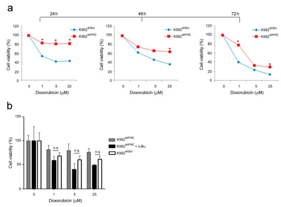 Cell viability of K562 cells treated with Doxorubicin. (a) Cell viability was assessed using the 3-[4,5-Dimethylthiaoly]-2,5-diphenyltetrazolium bromide (MTT) method on K562shScr and K562shFHC cells treated with Doxorubicin at the indicated doses. Final results represent mean ± SD of three independent experiments each performed in triplicate (* p < 0.05; n.s., not significant, p ≥ 0.05). (b). Cell proliferation was assessed using the MTT method on K562shScr, K562shFHC/pRc/CMV and K562shFHC/Rc/CMV-HA-IκBα cells treated with Doxorubicin at the indicated doses and transfected with IκBα. Final results represent mean ± SD of three independent experiments each performed in triplicate; n.s., statistically not significant, p ≥ 0.05).