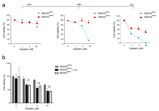 Parallel experiments were performed with SKOV3 ovarian cancer cells, using Cisplatin, a specific platinum-based antineoplastic drug for ovarian carcinoma. Cell viability of FHC-silenced SKOV3shFHC cells was significantly higher than control SKOV3shScr cells at high doses (five and 25 µM), with the most consistent difference in cell viability recordable at 48 and 72 h of treatment (Figure 4a). Transient transfection of IκBα expression vector significantly sensitizes SKOV3shFHC cells to drug at 48 h treatment (Figure 4a), thus suggesting again a central role of activated NF-κB pathway in this phenomenon.