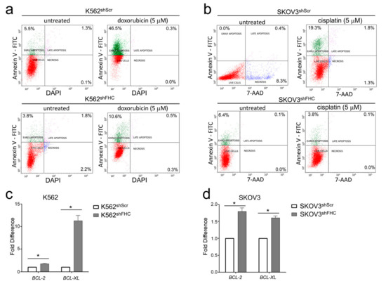 (a) Representative plots of Annexin V/DAPI apoptosis assays in K562shScr and K562shFHC. (b) Representative plots of Annexin V/7-AAD apoptosis assays in SKOV3shScr and SKOV3shFHC. Fluorescence-activated cell sorting (FACS) analysis was performed on three independent biological replicates. (c,d) Real-time PCR analysis of BCL-2 and BCL-xL mRNAs expression were performed on total RNA extracted from K562shScr, K562shFHC, SKOV3shScr, and SKOV3shFHC cells. Final results represent mean ± SD of three independent experiments. Statistical significance was evaluated by student t-test (* p < 0.05).